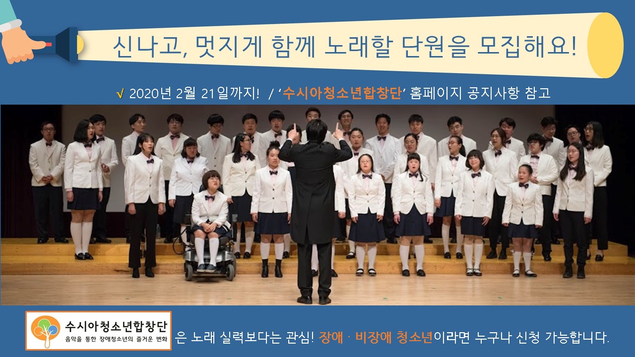 합창음악을 매개로 즐거운 변화를 실천 중인 장애ㆍ비장애 통합 합창단 수시아청소년합창단에서 합창단원을 공개 모집합니다.