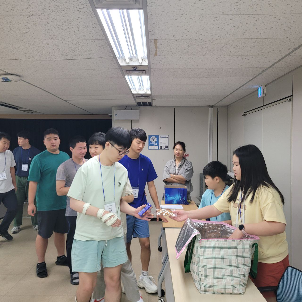 오늘 간식은 크로와상 빵과 사과주스입니다. 유0안 단원과 김서율 단원이 단원들에게 나눠주었습니다.