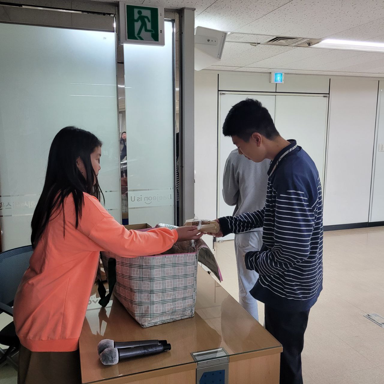 오늘 간식은 맛있는 크라와상 샌드위치입니다. 유0안 단원이 와서 단원들에게 나눠주었습니다.